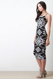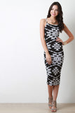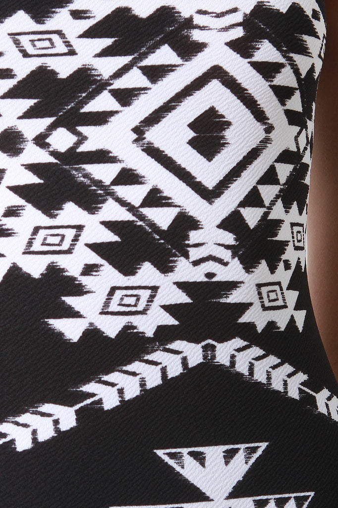 This bodycon dress features stretch knit, tribal pattern, spaghetti straps that criss-cross at back, and midi length. Accessories sold separately. Made in USA. 95% Polyester, 5% Spandex.