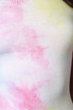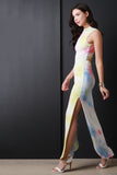 This maxi dress features pastel tie dye print, mock neck, back cutout, and double slit design. Accessories sold separately. Made in USA. 96% Rayon, 4% Spandex.