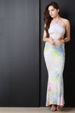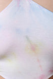 This pastel tie dye print, halter neck, cut out sides, and lace up back. Accessories sold separately. Made in USA. 96% Rayon, 4% Spandex.