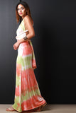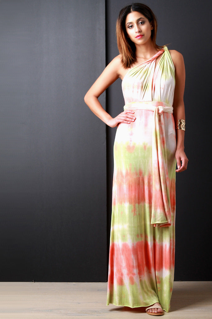 This beach-ready dress features a jersey knit fabrication with tie dye print design, long surplice sash for multiple style wrap options, and high waist cinched seam. Finished with a maxi-length hemline. Accessories sold separately. Made in U.S.A. 94% Rayon, 6% Spandex.