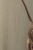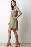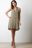 This dress features crinkled fabric, deep v-neckline, sleeveless construction, and attached statement necklace. Accessories sold separately. Made in USA. 100% Rayon.