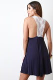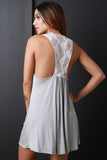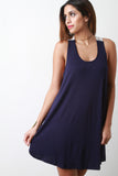 This casual dress features jersey knit, scoop neck, semi-sheer mesh racerback, and mini length. Accessories sold separately. Made in USA. 96% Viscose, 4% Spandex.