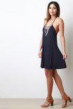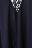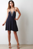 This casual dress features jersey knit, lace-up plunge neck, geo pattern trim, criss-cross back, and midi length. Accessories sold separately. Made in USA. 95% Rayon, 5% Spandex.