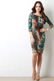 This bodycon dress features a contrasting two-tone snake print pattern, boat neckline, and long sleeves construction. Finished with a midi-length hemline. Accessories sold serapately. 95% Polyester, 5% Spandex.