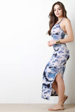 This knitted dress features a round neckline, sleeveless, spaghetti shoulder straps, crisscross back, stretchy sculpture fit, left side slit, and sponge paint print design. Accessories sold separately. Made in U.S.A. 96% Rayon, 4% Spandex.