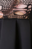 This chic dress features a burned out mesh top, round neckline, sleeveless fit, and pleated neoprene bottom with pencil skirt underlay. Accessories sold separately. Made in U.S.A. 95% Polyester, 5% Spandex.