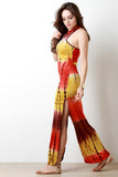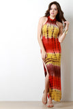 This sunset-toned dress features a jersey knit fabrication with tie dye print design, mock neckline, cutout back detail, and sleeveless fit. Finished with a rounded maxi-length hemline, and double side high slits. Accessories sold separately. Made in U.S.A. 96% Rayon, 4% Spandex.