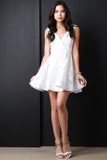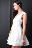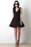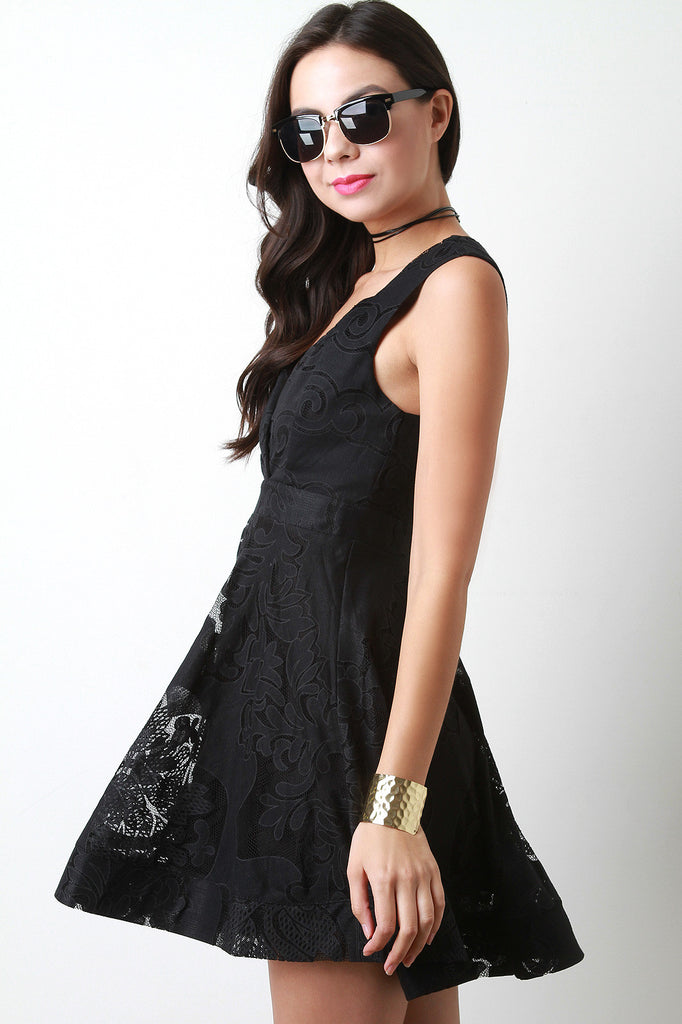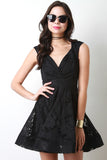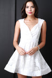This classics skater dress features a surplice neckline, sleeveless design, empire waist, lace fabrication, full skirt with structured mini length hemline. Accessories sold separately. 50% Cotton 50% Polyester.