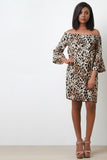 This chic shift dress features an off the shoulder elastic neckline, three quarter length ruffle sleeves, a boxy loose silhouette and a mini length hemline. Accessories sold separately. Made in U.S.A. 100% Polyester.