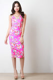 This beautiful midi dress features a v-neckline, backless design, spaghetti shoulder straps to a crisscross back, princess seam, high waisted seam panels, zipper fastener at rear, back vent slit, and floral print throughout. Accessories sold separately. Made in U.S.A. 96% Polyester, 4% Spandex.