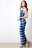 This dress features a jersey knit fabrication, tie dye print in stripe pattern, and thin shoulder straps to a crisscross back. Finished with a maxi-length hemline with back high slit. Accessories sold separately. Made in U.S.A. 96% Rayon, 4% Spandex.