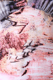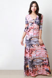 This maxi dress features a deep v-neckline with crisscross straps, quarter-length sleeves, and abstract print design. Accessories sold separately. Made in U.S.A. 95% Polyester, 5% Spandex.