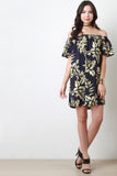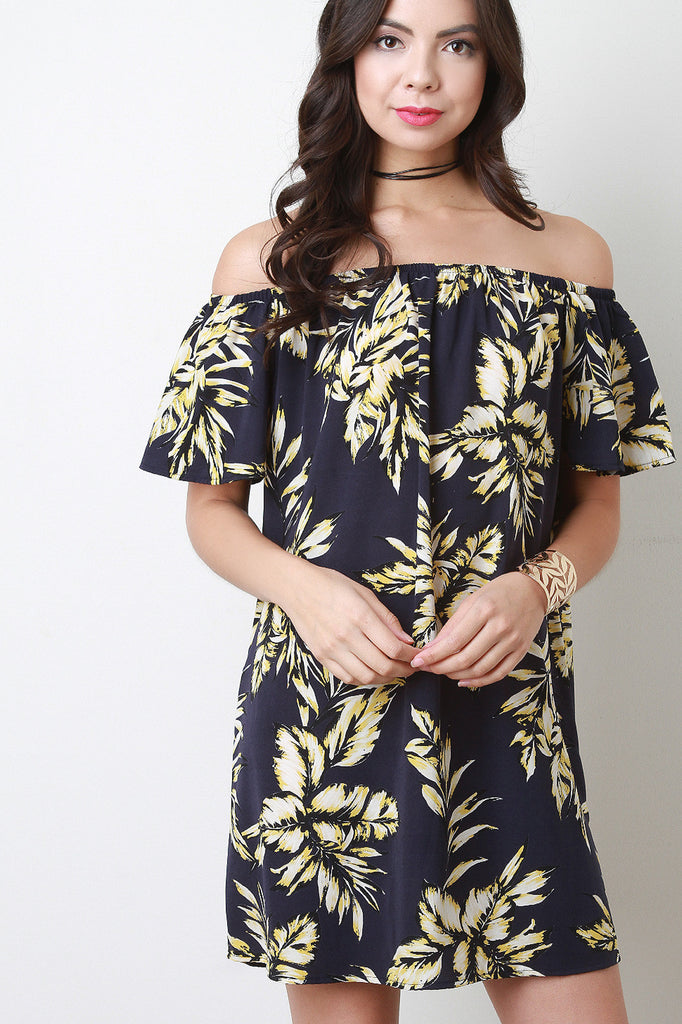 This cute shift dress features tropical leaf motif, elasticized off the shoulder neckline, and short sleeves. Accessories sold separately. Made in USA. 100% Polyester.
