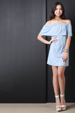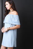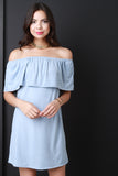 This trendy suede fabrication and elasticized off-the-shoulder neckline with ruffle overlay. Accessories sold separately. Made in U.S.A. 90% Polyester, 10% Spandex.