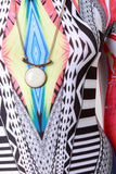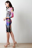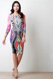 This eye-catching dress features a soft stretchy knit fabrication, colorful geometrical pattern print, boat neckline, and three quarter sleeves. Finished with a curve-hugging fit and midi-length hemline. Accessories sold separately. Made in U.S.A. 92% Polyester, 8% Spandex.