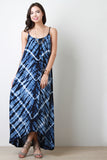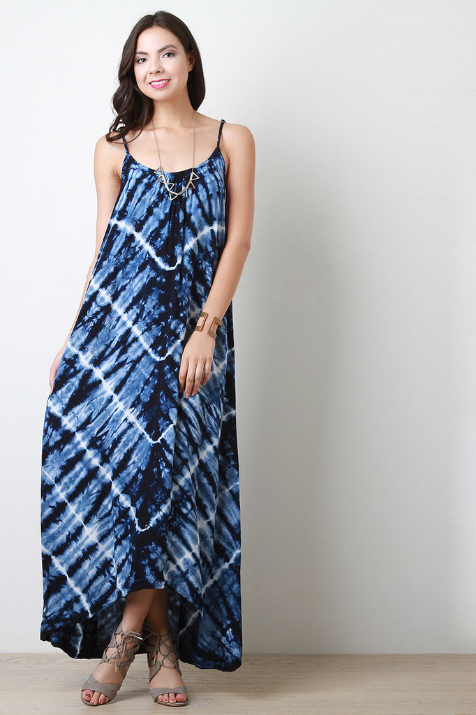 This maxi dress features a gathered scoop neckline, spaghetti straps, a woven fabrication, tie dye coloring, shift dress silhouette and a high low hemline. Accessories sold separately. 60% Polyester 35% Rayon, 5% Spandex