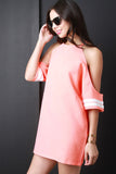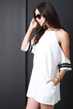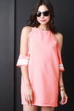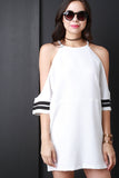 This simple chic mini dress features a high round neckline, contrasting double stripes accent at short sleeves, cold shoulder cutout, hidden side pockets, and shift cut fit. Accessories sold separately. 95% Polyester, 5% Rayon.