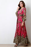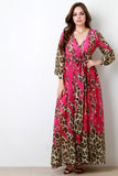 This gorgeous maxi dress features a chiffon fabric with contrasting slashed solid and leopard print, surplice neckline, and cuffed longsleeves with button accent. Finished with a self-tie waist ribbon. Accessories sold separately. 100% Polyester.
