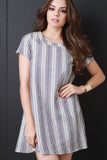 This casual dress features a rounded neckline, woven fabrication, striped pattern, loose shift dress fit with an a-line cut full lining and a mini length hemline. Accessories sold separately. 100% Cotton.