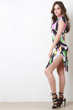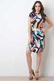 This dress features knit fabrication, abstract painted print a mock neck, cap sleeves, a curve hugging bodycon fit, high side slits and a rounded hem. Accessories sold separately. Made in U.S.A. 95% Polyester, 5% Spandex.