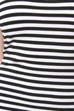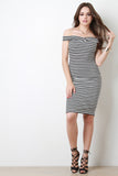 This sexy bodycon dress features soft stretch fabric, thin horizontal stripes, off the shoulder neckline, and midi length. Finished with back zipper closure. Accessories sold separately. Made in USA. 62% Viscose, 33% Nylon, 5% Spandex.