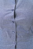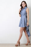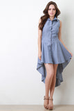 This dress features chambray fabric, button-up front, collar, sleeveless construction, and high-low hem. Accessories sold separately. Made in USA. 100% Cotton.
