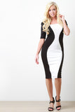 This modern style cocktail dress features a stretch knit fabrication, contrast center front and back hourglass panels, curve hugging bodycon fit, squared neckline half sleeves, back vent, and an invisible zipper closure. Accessories sold separately. Made in U.S.A. 33% Nylon, 62% Viscose, 5% Spandex.