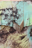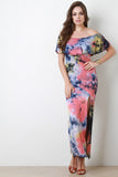 This maxi dress features multi color tie dye print design on jersey knit fabrication, elasticized off the shoulder neckline, flutter tier, and vent slit on right side. Accessories sold separately. Made in U.S.A. 96% Rayon, 4% Spandex.