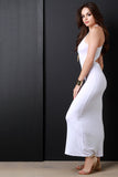 This casual dress features a jersey knit fabrication, round neckline, sleeveless fit, and racerback with open midsection. Finished with a maxi-length hemline. Accessories sold separately. Made in U.S.A. 95% Polyester, 5% Spandex.