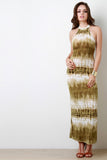 This dress features a smooth stretchy knit fabric with tie dye print pattern, round neckline, and sleeveless construction. Finished with a racerback with open midsection and maxi-length hemline. Accessories sold separately. Made in U.S.A. 95% Cotton, 5% Spandex.