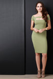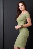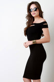 This chic dress features a ribbed knit fabrication, off the shoulder neckline, and slit details at front, back, and sleeves. Finished with a midi-length hemline. Accessories sold separately. Made in U.S.A. 95% Rayon, 5% Spandex.