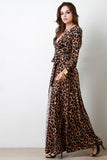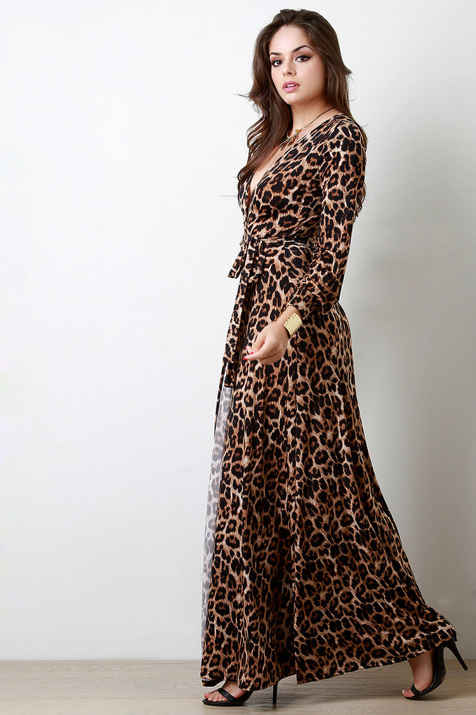This eye-catching dress features a soft flowy knit fabric with leopard print pattern, surplice v-neckline, and cuffed longsleeves. Finished with a self-tie waist sash and maxi-length hemline. Accessories sold separately. Made in U.S.A. 95% Polyester, 5% Spandex.
