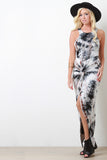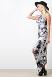 This casual dress features a sleeveless design, soft knit fabrication, tie dye coloring, princess seams, asymmetrical knotted drape skirt, fullylines and an exposed metal zipper closure. Accessories sold separately. 95% Rayon, 5% Spandex.