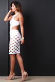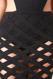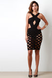 This daring dress features a smooth stretchy knit fabrication, crisscross front bandage with keyhole, side-to-back cutout, and grid-constructed pencil skirt. Finished with a back zip-up closure and brief underlay. Accessories sold separately. 63% Rayon, 32% Nylon, 5% Spandex.