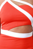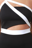 This bodycon dress features contrast trimming, one shoulder strap, keyhole cutout, asymmetrical hemline, and a hidden zipper fastener at back. Accessories sold separately. 32% Nylon, 63% Rayon, 5% Spandex.