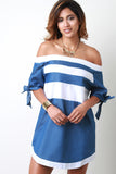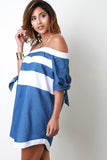 This chic dress features an off the shoulder elastic neckline, short tie hem sleeves, contrast white stripes, with a rounded mini length hemline and a boxy shift dress silhouette. Accessories sold separately. 100% Cotton. Contrast: 97% Cotton, 3% Spandex.