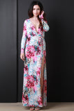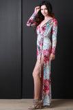 This dress is maxi silhouette, featuring a deep v-neckline and side slit. Semi elastic waist band with a self tie belted sash. Quarter long sleeves. Splattered floral print design throughout. Accessories sold separately. 95% Polyester. 5% Spandex.