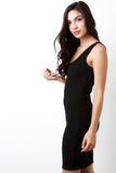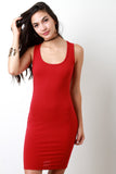 This casual dress features a ribbed knit fabrication, scoop neckline, sleeveless construction, and mini-length hemline. Accessories sold separately. Made in U.S.A. 60% Polyester, 35% Rayon, 5% Spandex.
