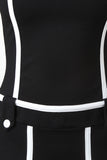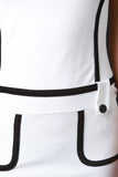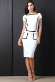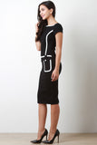 This chic midi dress features contrasting piping trimming front on ponte knit fabrication, square neckline, short sleeves, and pocket d�cor. Accessories sold separately. Made in U.S.A. 62% Viscose, 33% Nylon, 5% Spandex.