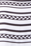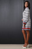 This shift dress features a mock neck line, woven fabrication, stripe pattern with a colorful border style hem, long sleeves and elastic cuffs, with a mini length hemline, finished with a double button closure at nape. Accessories sold separately. 100% Polyester.