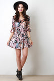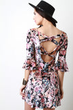 This chic dress features a stretch velvet fabrication, vintage inspired floral print pattern, scoop neckline, half sleeves with bell sleeve hem, princess seam construction, open back with cross strap details, and a flare mini hemline. Accessories sold separately. 95% Polyester, 5% Spandex.