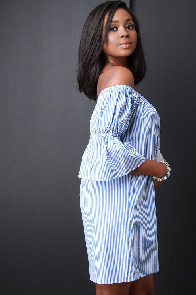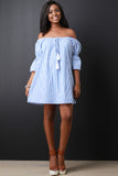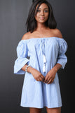 This dress features vertical stripes, elasticized bardot neckline, quarter-length flounce sleeves, and a self-tie tassel drawstring d�cor accent. Accessories sold separately. 100% Cotton.