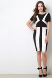 This midi dress is bodycon silhouette, featuring a round neckline, short sleeves, and a mid way adjustable back zipper. Designed with contrasting geometric shapes at front. Accessories sold separately. 33% Nylon. 62% Viscose. 5% Spandex.