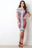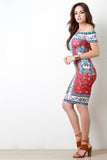 This beautiful dress features a porcelain-style floral print design, off the shoulder neckline, short sleeves construction, and midi-length hemline. Accessories sold separately. 95% Polyester, 5% Spandex.