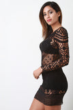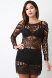 This beautiful dress features a semi-sheer crochet lace design, round neckline, scoop back with a self-tie closure, long scallop sleeves, and mini length hemline. Accessories sold separately. 30% Cotton, 70% Polyester.