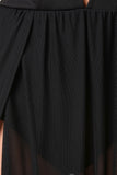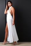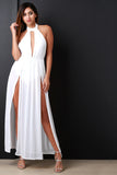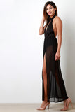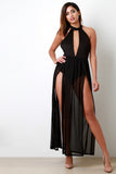 This daring dress features a stretchy knit fabric with contrasting mesh bottom maxi skirt, bare back construction, mock neckline, and front keyhole opening. Finished with brief underlay and high vent front slits. Accessories sold separately. Made in U.S.A. 95% Polyester, 5% Spandex.