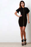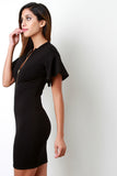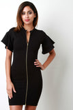 This bodycon dress features a smooth stretchy knit fabric, round neckline, front zipper fastener, short ruffled bell sleeves, and mini-length hemline. Accessories sold separately. Made in U.S.A. 68% Rayon, 27% Nylon, 5% Spandex.