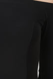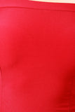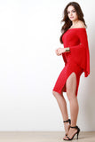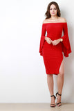 This chic dress features a smooth stretchy knit fabric, banded off the shoulder neckline, front seam detail, and ruffled bell sleeves. Finished with a midi-length hemline with side slit. Accessories sold separately. Made in U.S.A. 95% Polyester, 5% Spandex.