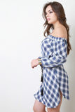 This alluring dress features a plaid knit fabrication, elasticized off the shoulder neckline, long sleeves with elastic cuffs, curved hemline, and finished with a self-tie tassel rope belt. Other accessories sold separately. 100% Rayon.