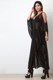 This mesh design; featuring cold shoulders, a strappy back design, and dolman sleeves. V-neckline and flare cut. Underlay not included. Accessories sold separately. 95% Polyester. 5% Spandex. Made in USA.